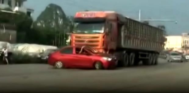 Điều đáng sợ là chiếc sedan nằm vào đúng điểm mù của tài xế xe tải khiến người này không hề hay biết mình gây ra vụ tai nạn. Chiếc xe tải chỉ dừng lại khi gặp đèn đỏ.