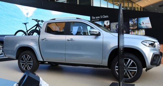 Phần đầu của X-Class gây ấn tượng bằng cụm đèn pha LED dạng thấu kính với dải đèn LED chiếu sáng ban ngày, lưới tản nhiệt 2 thanh to bản đặc trưng kèm logo ngôi sao ba cánh ở chính giữa