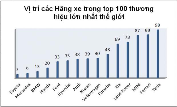 Đứng ở vị trí thứ 9 là Mercedes với giá trị thương hiệu là 47,829 tỷ USD, tăng 10% so với 2016. Ở phía sau, số 13, là BMW với 41,521 tỷ USD và Honda xuất hiện ở số thứ tự 20 với 22,696 tỷ USD.