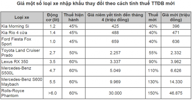 Đầu năm 2016, Bộ Tài chính cũng đã thay đổi cách tính thuế TTĐB dựa trên giá bán ra của nhà nhập khẩu (giá bán buôn) nhưng không được thấp hơn 105% giá vốn xe nhập khẩu. Theo quy định cũ, giá tính thuế chỉ là giá CIF nhập tại cảng kèm thuế nhập khẩu. Do đó, chi phí nhân công, vận chuyển, quảng cáo... cũng được gộp vào tính thuế.