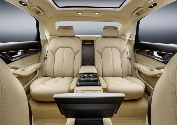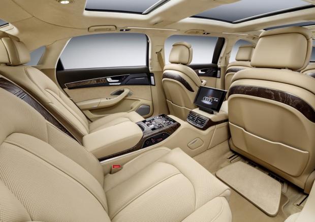 Bên trong chiếc xe Audi A8 L là 6 ghế ngồi bọc da Valcona siêu mềm hoàn thiện trong màu be. Hàng ghế thứ hai và thứ ba có chế độ tùy chỉnh tư thế ghế ngồi bằng điện, và hàng ghế thứ ba đặc trưng bởi bảng điều khiển, một tủ làm mát và màn hình giải trí.