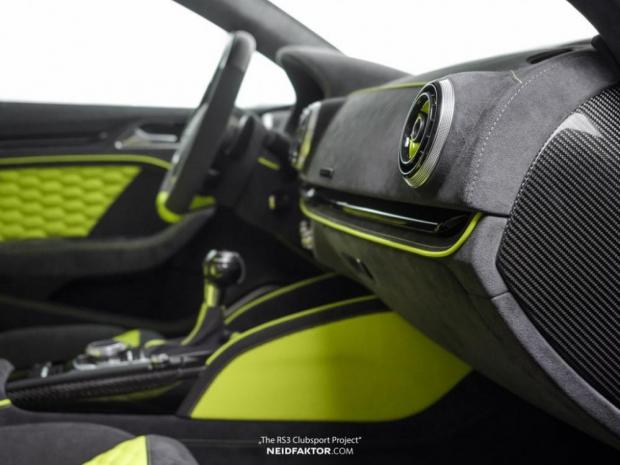 Việc sử dụng màu vàng dạ quang cho nội thất quả là một ý tưởng chơi trội. Một chuyên gia nội thất tại Đức, tên Neidfaktor lại khá hứng thú với ý tưởng này và tiến hành thử nghiệm ngay trên mẫu hatchback hiệu suất cao RS3. Sau độ, cabin của chiếc RS3 thậm chí trông còn kì thú hơn Audi R8.