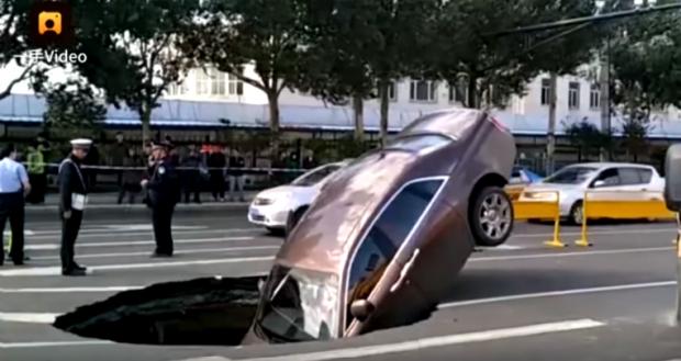 Chiếc xe tụt xuống hố trong lúc chờ đèn xanh trên đường ở Cáp Nhĩ Tân, thành phố thủ phủ của tỉnh Hắc Long Giang, đông bắc Trung Quốc hôm 1/10 vừa qua.