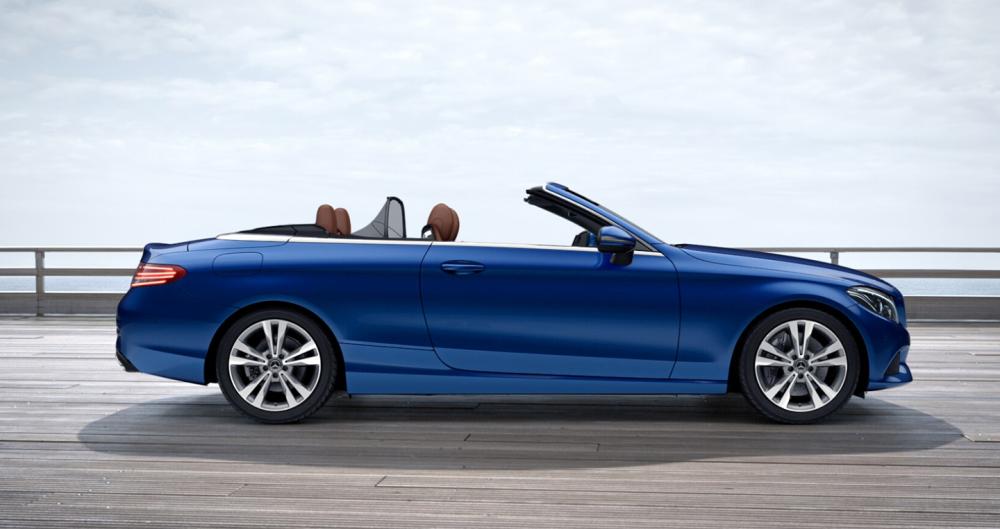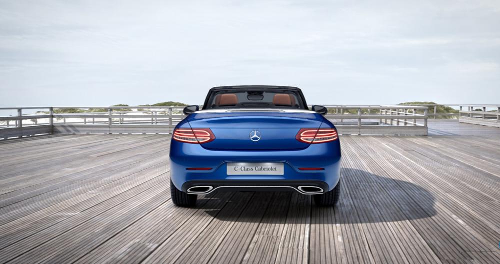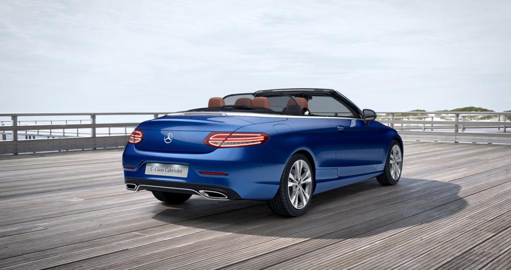 Được phát triển dựa trên bản Coupe, Mercedes C-Class Cabriolet cũng mang những nét nổi bật như thanh ngang kim loại gắn logo ngôi sao 3 cánh, lưới tản nhiệt mang họa tiết kim cương đen, thiết kế cụm đèn pha/hậu LED tương tự, gương chiếu hậu chỉnh điện và ống xả có chụp kim loại đặt đối xứng thể thao. Xe có tùy chọn 4 màu ngoại thất gồm nâu, đen, xanh dương và đỏ. Mâm xe là loại hợp kim đúc 18 inch 10 chấu.