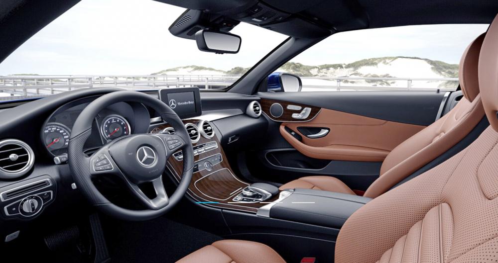 Về thiết kế nội thất, Mercedes C-Class Cabriolet có nhiều chi tiết được bọc da cao cấp, ốp gỗ bóng màu nâu line structure lime, ghế trước chỉnh điện tích hợp sưởi nhớ 3 vị trí, đồng hồ dạng ống đi kèm màn hình màu 5,5 inch, vô lăng thể thao bọc da đa chức năng. Một số trang bị nổi bật của C-Class Cabriolet có thể kể đến như màn hình cảm ứng 7 inch, hệ thống giải trí với đầu đọc CD, trình duyệt Internet, hệ thống âm thanh Burmester 13 loa công suất 590W, kết nối Bluetooth, tích hợp ứng dụng Apple CarPlay, Android Auto...