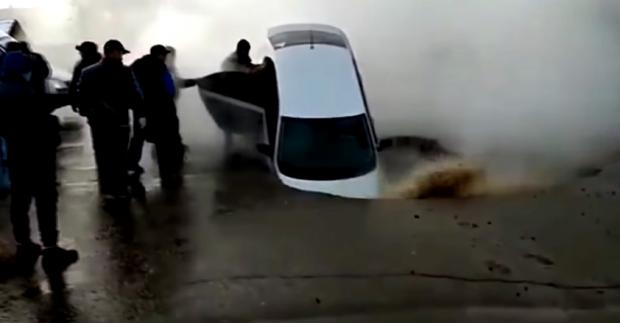 Có lẽ do tránh chiếc ô tô đi ngược chiều, một tài xế đã lao xuống mép hố tử thần dù thấy cột hơi nước bốc lên từ miệng hố. Chiếc xe nhanh chóng bị lún sâu do nước xói mòn mở rộng miệng hố.