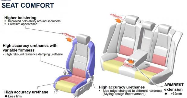 Theo công bố, Honda Accord 2018 sử dụng loại bọt Uretan mới được phát triển giúp ghế ngồi của xe có độ cứng/mềm khác nhau tùy từng vị trí. Cụ thể, khu vực hỗ trợ đùi trên ghế ngồi sẽ mềm hơn còn phần hông sẽ cứng hơn. Bên cạnh đó, Honda đã nâng cao phần đệm tựa lưng trên Accord 2018 thêm 125 mm ở mỗi bên trên ghế trước và 50 mm trên ghế sau. Cùng với đó là bệ tỳ tay trung tâm ghế sau cũng được kéo dài thêm 50 mm.