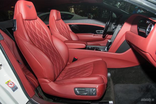 Ở bên trong, nội thất xe được bọc da màu đỏ vô cùng bắt mắt. Bentley trình làng Continental GT Speed có thiết kế 4 chỗ ngồi tuy nhiên hai vị trí phía sau khá chật và chỉ phù hợp dành cho những người có thể trạng nhỏ hoặc trẻ em. Toàn bộ đều được bọc da cao cấp với những vân chỉ hình kim cương tại vị trí ngồi. Ghế lái và ghế phụ có khả năng chỉnh điện nhiều hướng kèm nhớ vị trí.
