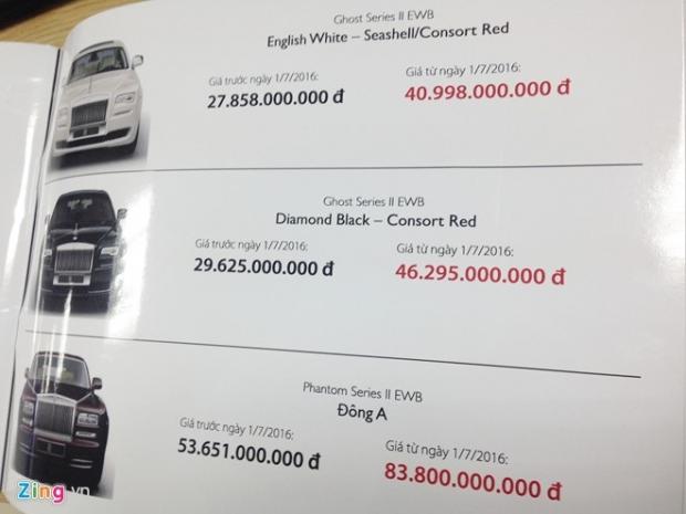 Trong số các dòng xe Rolls-Royce tăng giá bán do biểu thuế mới, các phiên bản hàng thửa, độc bản dựa trên dòng Phantom Series II EWB có mức tăng khá cao. Chiếc Phantom Series II EWB Đông A mang văn hóa thời Trần cùng nhiều họa tiết độc đáo khác có giá bán trước 1/7 là 53,6 tỷ đồng. Sau 1/7, mức giá của xe tăng lên 83,8 tỷ, chênh khoảng 30 tỷ đồng.