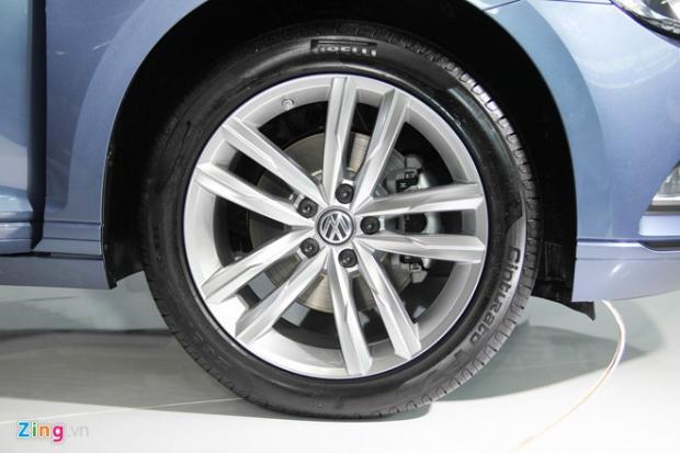 La-zăng 5 chấu kép bằng hợp kim đúc, đường kính 18 inch. Passat mới có độ cao gầm thấp hơn phiên bản cũ 14 mm, vì vậy dáng vẻ thể thao hơn.