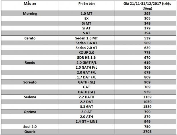 Bên cạnh Morning, Thaco cũng thực hiện giảm giá cho các mẫu xe Kia khác cũng được giảm giá, bao gồm Kia Cerato (giảm đến 32 triệu đồng), Rondo (giảm 23 triệu đồng), Sorento (giảm khoảng 10 triệu đồng) và Optima (giảm 25 triệu đồng). Ngược lại, mẫu xe Sedona có mức tăng giá nhẹ bởi động cơ lớn.