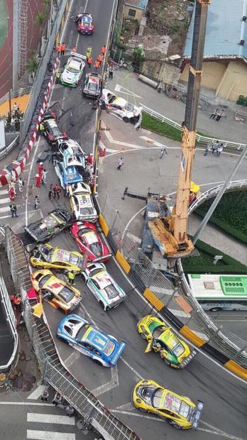 Cuộc đua ngay lập tức được gắn cờ đỏ, với cần cẩu cứu hộ nhanh chóng được điều đến. Thời gian còn lại của cuộc đua đã được kéo dài thêm 25 phút. Sự cố được đánh giá là nghiêm trọng, thậm chí bình luận viên thể thao trực tiếp đã phải thốt lên rằng 'đã có hàng triệu USD bị vứt đi sau cú va chạm dây chuyền này'.Clip ghi lại cảnh tai nạn chưa từng thấy tại chặng Macau vừa qua