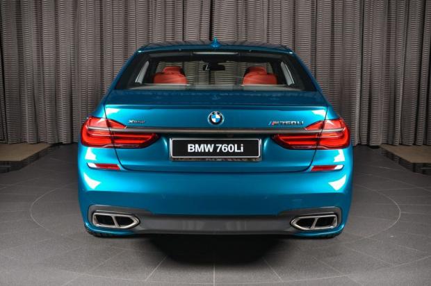 Xuất hiện nổi bật với màu xanh dương đặc biệt - có tên Long Beach Blue, BMW M760Li cũng được hưởng lợi từ bộ thiết kế thân xe hiệu ứng 3D, kết hợp cùng bộ chắn gió phía trước giống của Alpina và cánh lướt gió phía sau.