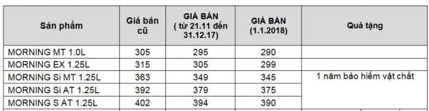 Đáng chú ý, bản thấp nhất của Morning là MT 1.0L giảm từ 305 triệu đồng xuống còn 295 triệu đồng. Giá sau 1/1/2018 là 290 triệu đồng. Đây là mức thấp chưa từng thấy và thấp hơn bản base 1.0L MT của đối thủ cạnh tranh trực tiếp Hyundai i10 tới 15 triệu đồng.