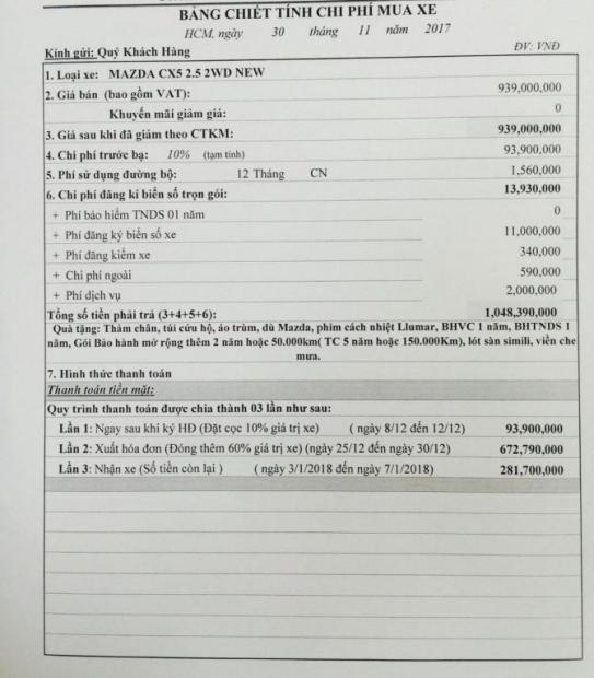 Dự kiến, xe được giao cho khách hàng vào khoảng ngày 3/1/2018 đến 7/1/2018. Giá bán công bố của Mazda CX-5 2018 bản 2.5 2WD là 939 triệu đồng.