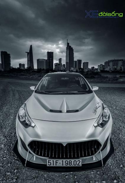 Nhưng với mục tiêu trở thành chiếc Kia K3 độ body độc nhất Việt Nam, chỉ widebody thôi thì vẫn chưa đủ và cần phải làm cái gì đó táo bạo hơn. Nhiều ý tưởng được bàn thảo và cuối cùng, xưởng độ PhiLong chọn phương án độ lấy cảm hứng từ siêu xe đường phố Maserati Granturismo MC Stradale, và nếu là một fan của Maserati thì hẳn bạn sẽ nhận ra ngay điều này khi nhìn vào phần đầu và đuôi xe, ở lưới tản nhiệt, cản trước và cản sau. Không hãng độ nào thiết kế sẵn bộ bodykit kiểu Maserati như này cho Kia K3 và đây là một sáng tạo ấn tượng do chính những người thợ ở PhiLong thực hiện. Mẫu thiết kế này cũng rất tương hợp với đường nét mềm mại nguyên bản của K3. Những nẹp lướt gió cản trước, bên sườn và cánh gió đuôi cỡ lớn bằng sợi carbon khiến chiếc xe nhìn như một chiếc xe đua thể thao mạnh mẽ.