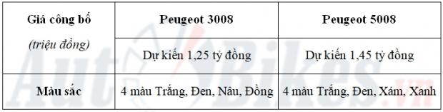 Giá của 2 mẫu Peugeot sẽ được Thaco (Trường Hải) công bố vào tối nay. Tuy nhiên ở thời điểm hiện tại khách hàng đã có thể đặt hàng xe với giá tạm tính 1,25 tỷ đồng cho 3008 và 1,45 tỷ đồng cho 5008.