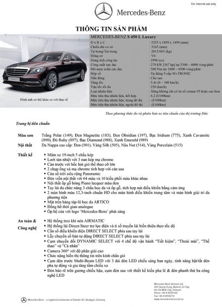 Cả 2 phiên bản S450 L và S450 L Luxury tại Việt Nam đều có cấu hình dẫn động cầu sau và hộp số tự động 9 cấp 9G-TRONIC. Sức mạnh từ động cơ tăng áp kép 3,0 lít V6 có thể giúp chiếc sedan cao cấp cỡ lớn tăng tốc từ 0-100 km/h trong 5,4 giây, trước khi đạt tốc độ tối đa được giới hạn ở mức 250 km/h.