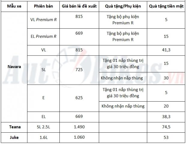 Khách hàng mua xe Navara vẫn được bộ phụ kiện Premium R khi mua phiên bản Navara VL Premium R và EL Premium R kèm theo quà tặng tiền mặt từ 5 - 15 triệu đồng. Các mẫu E và SL được tặng 1 nắp thùng trị giá 30 triệu đồng, nếu không nhận nắp thùng sẽ được tặng quà tiền mặt nhiều hơn từ 20 - 30 triệu đồng. Ngoài ra, 2 mẫu Navara VL và EL được hỗ trợ quà tặng tiền mặt 38, triệu cho mẫu EL và 41,3 triệu đồng cho mẫu VL.