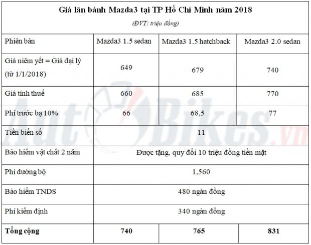 Giá lăn bánh của Mazda3 tại TP Hồ Chí Minh trong năm 2018