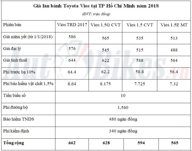 Như vậy, giá lăn bánh Toyota Vios trong năm 2018 tại Hà Nội là 586 triệu đồng cho Vios 1.5E MT, 616 triệu cho bản Vios 1.5 CVT, 659 triệu cho bản Vios 1.5G CVT và 685 triệu với bản Vios TRD 2017.