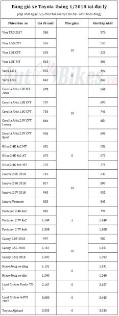 Theo tìm hiểu của AutoBikes, trong tháng 1/2018, giá những mẫu xe Toyota lắp ráp trong nước bao gồm Toyota Vios, Corolla Altis, Camry, Innova đồng loạt chỉ còn giảm 10 triệu đồng so với giá đề xuất so với mức giảm phổ biến từ 20-50 triệu đồng của tháng trước.