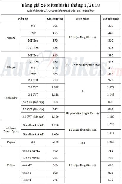 Dưới đây là bảng giá chi tiết các mẫu xe Mitsubishi trong tháng 1/2018: