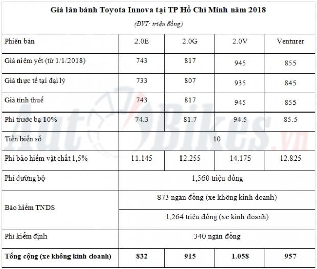 Theo đó, giá lăn bánh Toyota Innova đối với xe không kinh doanh năm 2018 tại TP. Hồ Chí Minh thấp hơn Hà Nội gần 30 triệu đồng, lần lượt từ 832 triệu đồng cho bản 2.0E, 915 triệu cho bản 2.0G, 1,058 tỷ đồng cho bản 2.0V, triệu cho bản và 957 triệu với bản Venturer.