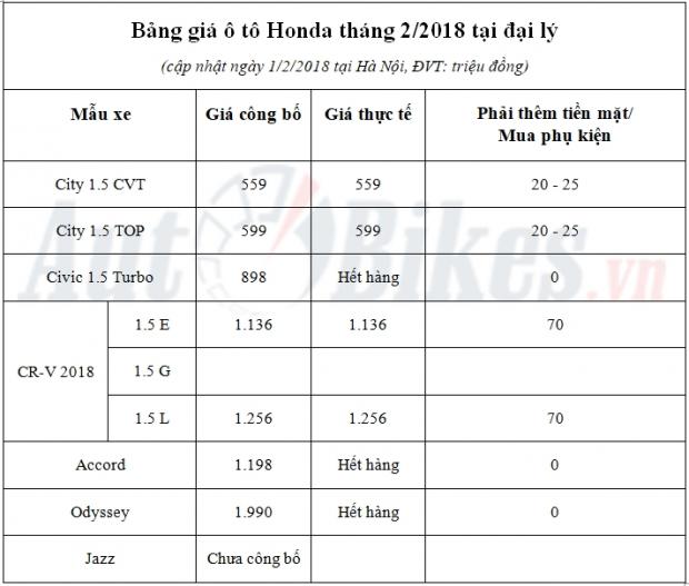 Dưới đây là chi tiết giá bán các mẫu xe Honda tại đại lý trong tháng 2/2018:
