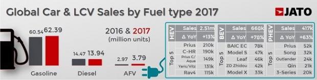 Dòng xe hybrid cho thấy sự tăng trưởng mạnh mẽ, với mức tăng 27,7%, đạt 3,79 triệu xe, và chiếm thị phần 4,4% toàn cầu, tăng 0,9% so với năm 2016. Nhật Bản là một trong những thị trường lớn nhất và có ý nghĩa quan trọng nhất với dòng xe này. Tuy nhiên, Na Uy vẫn duy trì được thị phần đứng đầu lên tới hơn 40% doanh số bán ra, tiếp theo là Nhật Bản ở mức 27,8% và Israel là 9,5%.