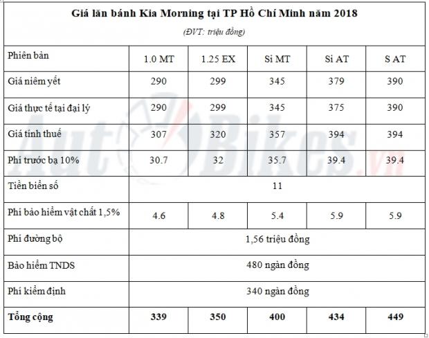 Có thể thấy, giá lăn bánh Kia Morning năm 2018 tại TP. Hồ Chí Minh thấp hơn Hà Nội khoảng 15 triệu đồng lần lượt là 339 triệu cho bản 1.0 MT, 350 triệu cho bản 1.25 EX, 400 triệu cho bản Si MT, 434 triệu cho bản Si AT và 449 triệu cho bản S AT.