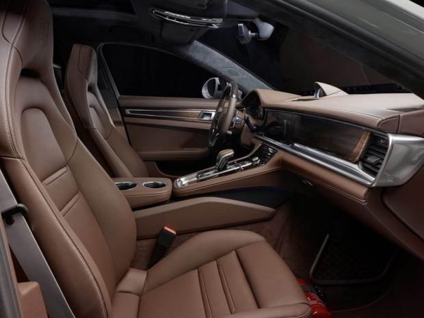 Về nội thất, toàn bộ khoang cabin của Panamera Turbo được chìm trong da bọc màu nâu ấm áp, kết hợp với các yếu tố làm từ gỗ và nhôm độc đáo. Ngoài ra, xe còn nhận được một lót trần Alcantara màu than và Porsche Design cũng cung cấp cho xe một chiếc đồng hồ tinh xảo.