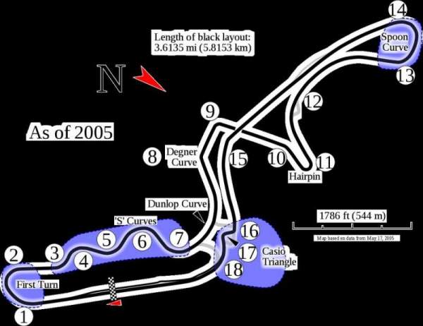 Suzuka là trường đua hiếm hoi của thế giới có thiết kế theo dạng số 8, với những khúc cua chữ S “ngoằn ngoèo” siêu gấp, những đoạn lên dốc xuống dốc trên mặt nghiên cùng với đó là cả những đoạn đường thẳng để thể hiện sức mạnh. Trường đua có tổng chiều dài mặt đường lên tới 5,807km với 18 khúc cua, trong đó khúc cua số 11 được mệnh danh là “nấc thang lên thiên đường”.