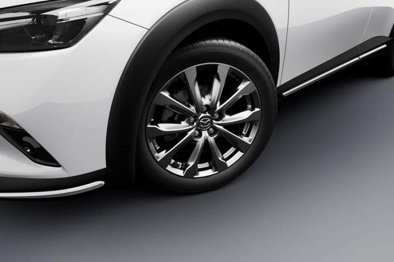 Tiếp theo, chiếc xe thể thao cưỡi trên bộ bánh xe 5 chấu kép đa diện mới, kích thước 18 inch, và được hoàn thiện trong lớp phủ ánh kim. Các cột cửa sổ và viền đèn sương mù được sơn đen bóng, đồng thời bổ sung vào bảng màu ngoại thất của CX-3 màu đỏ Crystal mới - cũng bắt nguồn từ CX-5.