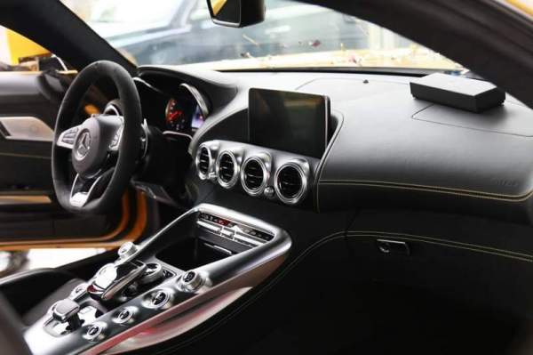 Bên trong, “chất” thể thao của AMG GT thể hiện qua vô-lăng ba chấu tích hợp lẫy chuyển số và các nút điều khiển. Các chi tiết như ghế ngồi, trần xe đều được bọc da nhân tạo màu đen, chỉ khâu màu vàng tương phản. Hệ thống âm thanh Burmester 11 loa công suất 1.000W.