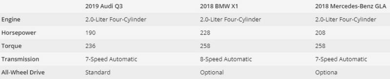 Đây chỉ là phiên bản cấp thấp nhất của Q3 mới, Audi có cung cấp cho Q3 một lựa chọn sức mạnh tầm trung khác mạnh 230 mã lực. Đặc biệt, Audi Q3 2019 còn có một lợi thế bán hàng hơn hẳn so với hai đối thủ, đó là hệ dẫn động bốn bánh toàn thời gian theo tiêu chuẩn, ở X1 và GLA tính năng này nằm trong danh sách tùy chọn mất phí.