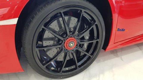 Tạo điểm nhấn cho 'bộ vó' của chiếc Lamborghini Huracan LP610-4 màu đỏ này chính là bộ khoá bánh xe màu đỏ 'tông xuyệt tông' ngoại thất.