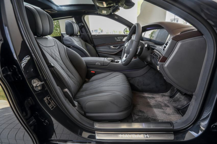 Phần phía trước của cabin tương đối giống với Mercedes-Benz S-Class thông thường,vô-lăng bọc da 3 chấu, màn hình kép 12,3 inch, bảng táp-lô trung tâm là đồng hồ IWC, cửa điều hòa mang thiết kế đặc trưng và cụm điều khiển COMAND ở giữa. Hàng ghế phía trước có hai cổng USB, khe cắm thẻ SD, GPS và khay sạc không dây. Logo Maybach khắc nổi trên bệ tì tay.