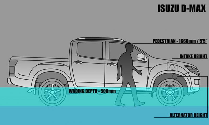 Cùng có cửa hút gió cao ngang nhau so với Chevrolet Colorado nhưng Isuzu D-Max chỉ lội được nửa mét vì vị trí máy phát điện đặt thấp hơn