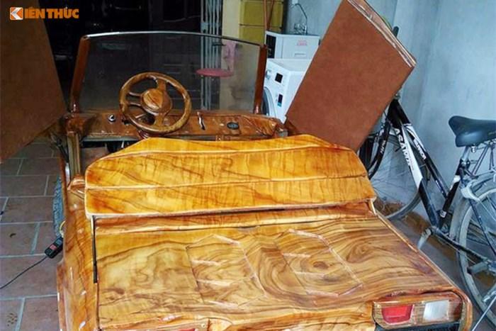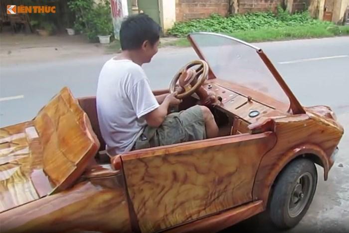 Chiếc xe làm từ gỗ có vẻ đủ chỗ ngồi cho 2 người ngồi. Xe có thể đánh lái bằng vô-lăng giống với những chiếc ôtô thực sự. Chưa hết, phần đuôi cũng được sáng tạo y thiết kế “bò mộng” từ bộ đèn cho đến ống xả kép…