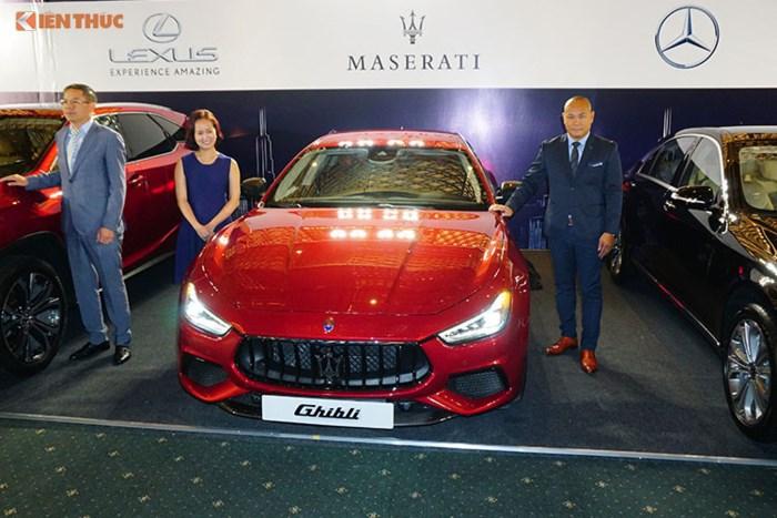 Trong ảnh là đại diện Maserati tại Việt Nam cùng mẫu xe sang thể thao Ghibli GranSport 2018. Tại VMS 2018 hãng xe sang Ý sẽ đem thêm Quattroporte, SUV Levante hay mẫu xe thể thao mui trần GranCabrio Sport đến trưng bày và chào hàng khách tham quan.