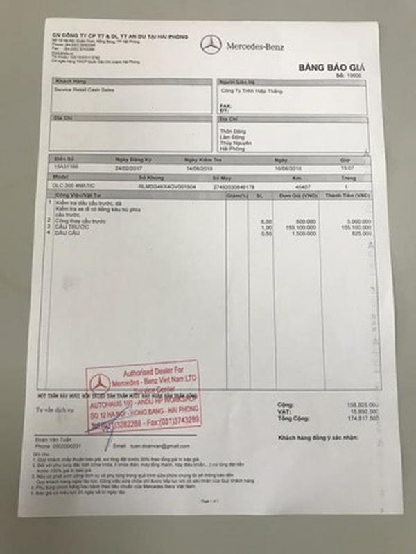 Chi phí sửa chữa lỗi trên xe GLC lên tới hơn 170 triệu đồng (bao gồm VAT). Điều đáng nói là toàn bộ số tiền chi phí này do ông phải chi trả.
