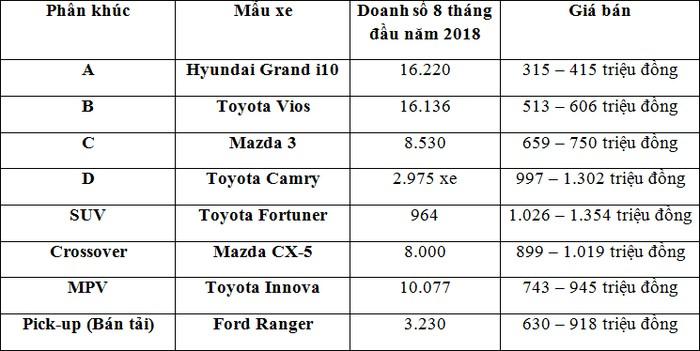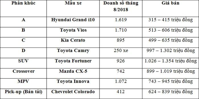 Trong danh sách, có 2 mẫu xe là Kia Cerato và Chevrolet Colorado đứng đầu lần lượt phân khúc C và bán tải tại Việt Nam trong tháng 8/2018. Tuy nhiên nếu tính 8 tháng đầu năm 2018, 2 mẫu xe này không phải mẫu xe đứng đầu mà thay và đó là Mazda 3, đứng đầu phân khúc C với 8.530 xe bán ra và Ford Ranger đứng đầu phân khúc bán tải với 3.230 xe bán ra.