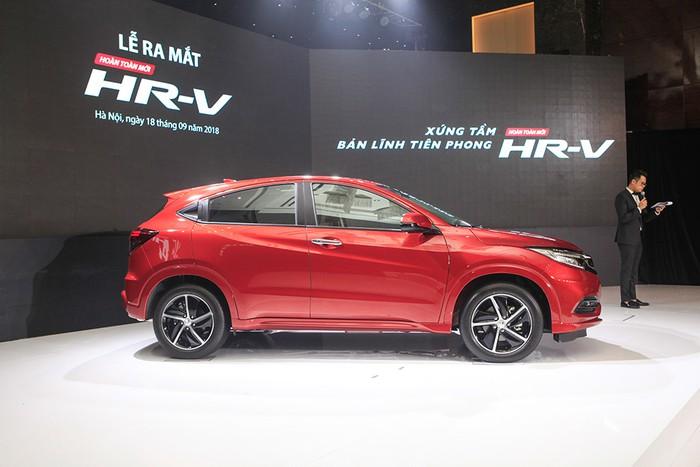 Phần hông xe nổi bật với những đường gân dập nổi xuyên suốt từ hệ thống đèn pha cho tới đèn hậu. Cột B trên HR-V được sơn đen cùng màu kính và vị trí mở cửa sau được tích hợp trên cột C khá lạ mắt.