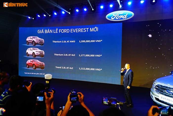 Ngoài ra, các phiên bản khác được trang bị động cơ 2.0L Turbo đơn sản sinh công suất 180 PS, mô-men xoắn cực đại 420 Nm. Tất cả các bản AT đều đi kèm hộp số 10 cấp trong khi bản MT dùng hộp số 6 cấp. Ford Everest 2018 sẽ được bán ra tại thị trường Việt Nam với giá tạm tính từ khoảng 900 triệu đến 1,2 tỷ đồng.