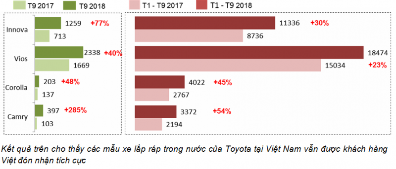 Công ty Ô tô Toyota Việt Nam (TMV) vừa công bố tổng doanh số bán hàng các mẫu xe Toyota trong tháng 9/2018 đạt 6.259 xe (không bao gồm xe Lexus), tăng trưởng 52% so với cùng kỳ năm 2017. Đồng thời, thị phần của TMV trong tổng thị trường (không bao gồm xe tải và xe buýt) trong tháng 9, tăng 3% so với cùng kỳ năm ngoái.