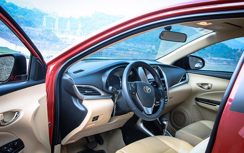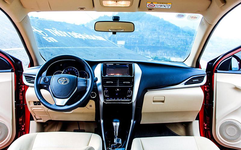 Bên trong xe, Toyota Vios 2018 gây ấn tượng với bảng điều khiển trung tâm kích thước lớn và trực quan hơn, đặt giữa hai dải mạ bạc gợi cảm hứng mạnh mẽ, nổi bật. Nội thất với ghế bọc da, hàng ghế sau với khả năng tạo vị trí ngồi thoải mái hơn: ngả lưng lên 25˚. Hệ thống cửa gió cũng được thiết kế mới, trải đều hai bên, với viền bọc kim loại. Hệ thống điều hòa tự động cũng được trang bị cho mẫu xe hạng B này.