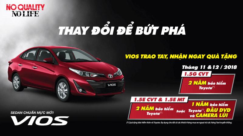 Toyota Việt Nam hiện đang thực hiện chương trình “Vios trao tay, nhận ngay quà tặng” dành cho tất cả các khách hàng mua xe Toyota Vios từ ngày 1/11 đến hết ngày 31/12/2018 với 3 phiên bản Vios 1.5G CVT, Vios 1.5E CVT và Vios 1.5E MT. Theo đó: