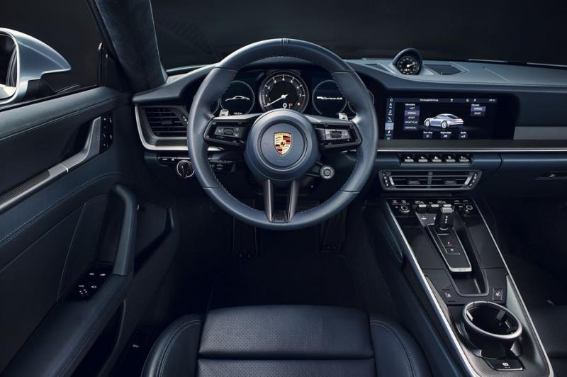 Bước vào trong xe, 911 thế hệ mới tiếp tục gây ấn tượng với không gian nội thất hiện đại và tinh tế, gồm một màn hình cảm ứng 10,9 inch trung tâm, có thiết kế như một chiếc máy tính bảng nhỏ, cùng vô lăng 3 chấu quen thuộc tích hợp lẫy chuyển số, cụm đồng hồ điện tử vẫn là kiểu 3 vòng tròn, tuy nhiên cần số đã được làm gọn gàng hơn trước.