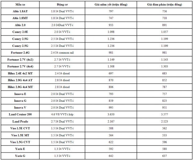 Dưới đây là bảng giá các mẫu ô tô của Toyota trong tháng 6/2017: